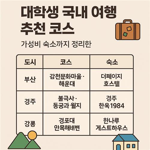 여행 가고 싶은 마음은 굴뚝같은데, 현실은 얇은 지갑... 우리 대학생들에게 익숙한 이야기죠! 하지만 알뜰살뜰 준비하면 적은 예산으로도 충분히 알차게 국내 여행을 즐길 수 있답니다. 이 글에서는 교통, 일정, 숙소까지 한 번에 정리된 추천 코스를 소개해드릴게요. 친구와 함께, 혹은 혼자서도 부담 없이 떠날 수 있는 여행, 지금 바로 시작해볼까요?