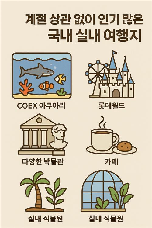 여행은 날씨에 따라 계획이 바뀌기 쉬운데요, 특히 비가 오거나 무더위, 혹은 추위가 극심할 때는 야외 활동이 어렵죠. 그래서 오늘은 계절과 상관없이 언제든지 즐길 수 있는 국내 실내 여행지를 소개해드리려 해요. 쾌적한 실내에서 즐기는 여행, 누구에게나 필요한 힐링의 시간이 아닐까요? 편하게 읽어보시고, 여러분의 취향에 맞는 여행지를 찾아보세요!
