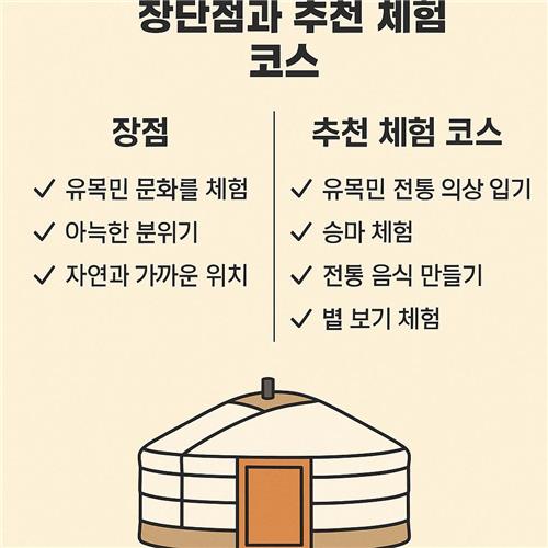 | 문화 경험 | 전통 유목민 생활을 직접 체험, 현지 가정 방문·식사 등 프로그램 연계 | 문화 차이로 인한 음식·생활 방식의 낯섦 |