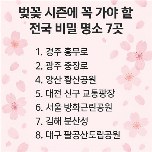 봄바람이 살랑살랑 불어오는 계절, 벚꽃이 피기 시작하면 어디론가 떠나고 싶어지죠. 유명한 벚꽃 명소도 좋지만, 사람들로 붐비지 않는 조용한 비밀 장소에서 벚꽃을 즐기고 싶을 때가 있어요. 이번 글에서는 그런 여러분을 위해 전국 각지의 숨겨진 벚꽃 명소 7곳을 소개하려고 해요. 가족, 연인, 친구 누구와 가도 좋고, 혼자만의 힐링 여행지로도 딱 좋은 곳들이니 꼭 끝까지 읽어주세요!
