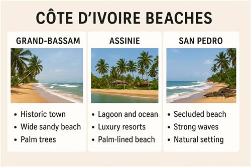 서아프리카 안에서도 가나, 세네갈 등의 해변과 비교했을 때 아이보리코스트는 다양한 유형의 해변을 한 국가 안에서 경험할 수 있다는 점이 눈에 띕니다. 그랑바상처럼 유네스코 역사 도시와 연결된 해변부터, 아씨니처럼 라군과 바다가 공존하는 반도 지형, 모노가가처럼 거의 손대지 않은 자연 비치까지 성격이 확연히 다르거든요.:contentReference[oaicite:31]{index=31}