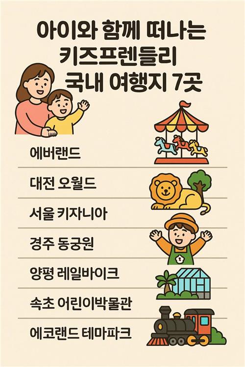아이와 함께 떠나는 여행은 준비할 것도 많고 걱정도 앞서지만, 다녀오고 나면 무엇보다 오래 기억에 남는 추억이 되곤 합니다. 특히 어린아이와의 국내 여행은 이동 시간, 화장실과 수유 공간, 유모차 동선, 식당 메뉴까지 신경 쓸 것이 정말 많지요. 그래서 이번 글에서는 부모 입장에서 꼼꼼하게 살펴본 키즈프렌들리 국내 여행지 7곳을 한 번에 정리해 보았습니다. 서울·경기 근교는 물론, 바다와 역사 도시, 자연 체험까지 골고루 담았으니 우리 아이와의 첫 여행 코스를 고를 때 편하게 참고해 보세요.