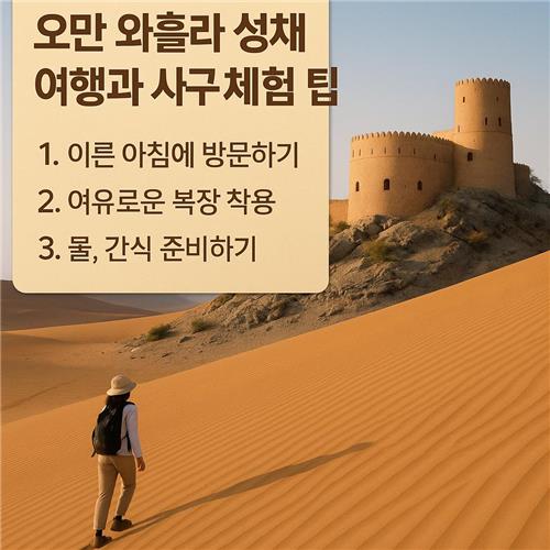 와흘라 성채와 사구 체험은 단순한 여행지를 넘어 시간과 공간을 초월한 경험이 되어줍니다. 고요한 사막에서 바라보는 일출, 과거의 흔적이 담긴 성채의 돌담, 그리고 친절한 현지인들과의 만남까지… 오만에서만 누릴 수 있는 감동을 여러분도 꼭 느껴보시길 바라요.