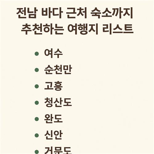 오늘 소개해드린 전라남도의 여행지와 바다 근처 숙소 리스트, 어떠셨나요? 남도의 바다는 늘 푸르고 따뜻하며, 자연과 문화를 함께 즐길 수 있는 매력이 가득하답니다. 가족, 연인, 친구 누구와 함께든 좋은 추억을 만들 수 있는 전남 바닷가로 이번 주말 나들이 떠나보세요! 당신만의 전남 여행지 추천이 있다면 댓글로 함께 나눠주세요!