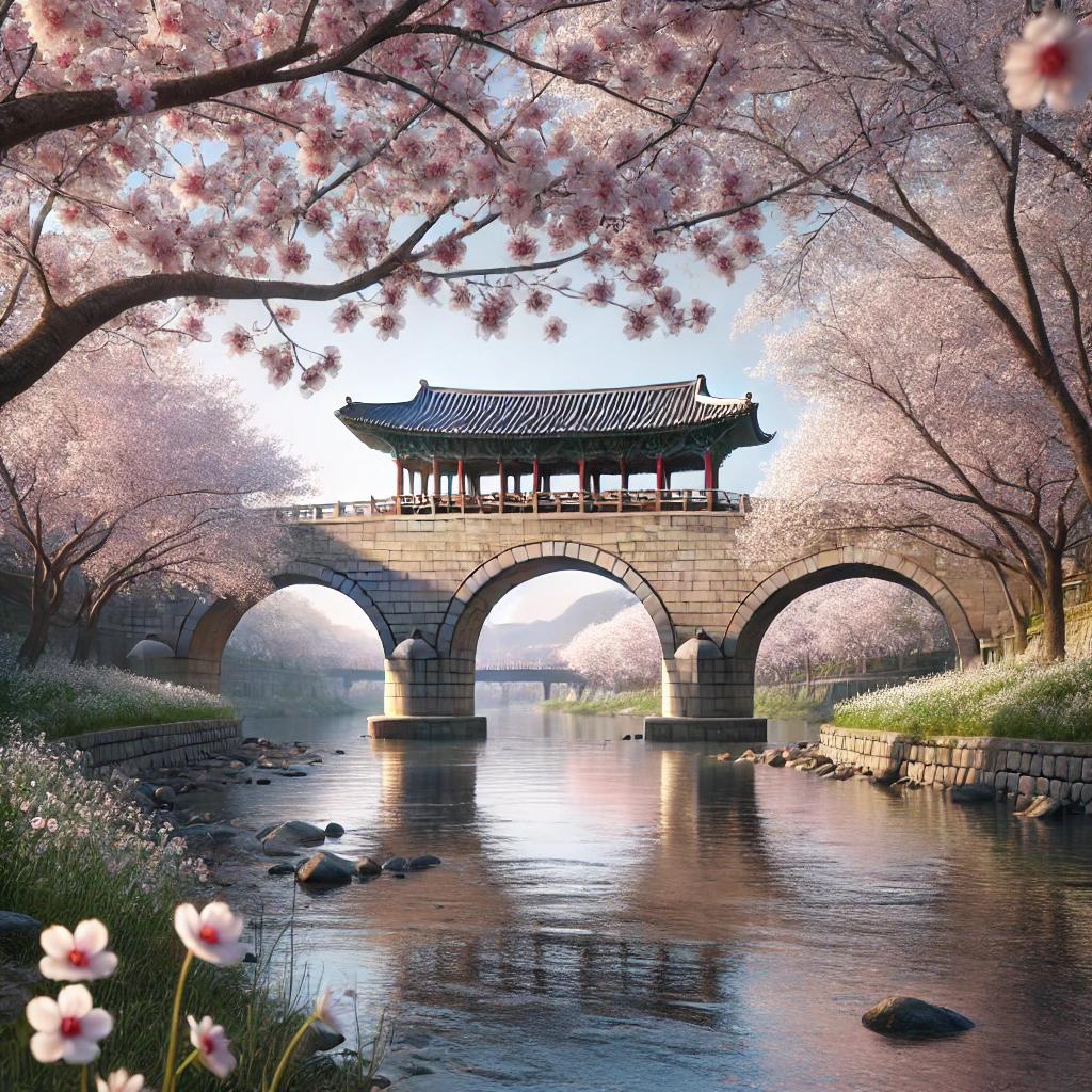 특히 봄이 되면 다리 양옆으로 수십 그루의 벚나무가 만개하여, 고즈넉한 다리와 어우러진 풍경은 그야말로 한 폭의 그림 같답니다.